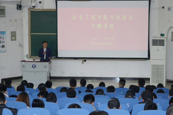 讲座伊始,黄军利部长提出几个问题启发学生思考、回答,极大地调动了在场学生的注意力和积极性。随后,黄部长结合自身经历、矿院发展史实和行业发展形势,引导学生思考社会发展与个人成长联系,激励学生勤奋学习,增长专业本领,做好大学生涯规划,将个人价值融入社会发展大势。谈到学生成长成材方面,黄部长从中国优秀传统文化出发,引经据典,生动形象地为同学们讲述了读书和提高自身文化素养的重要性,勉励大家不仅要加强专业学习,更要注重自我文化素养的修炼。最后,黄部长给大家播放了一个心理学方面的视频,“蓬生麻中,不扶自直”,黄部长再次强调优良学风环境的重要性,希望同学们努力学习,扎实提高专业能力,全方位提升自身素质。