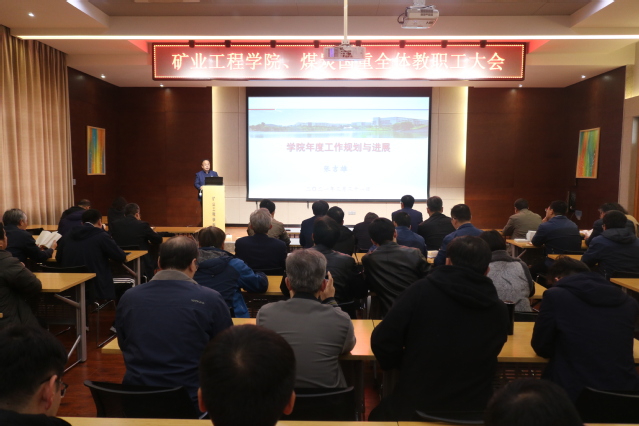 院长张吉雄从学院学科建设工作、师资队伍建设、科技创新服务、人才培养工作、国际合作与交流、管理服务工作共六个方面总结了2020年度工作成效,并通报了2021年度工作规划与近期工作进展。2020年学院坚持疫情防控和事业发展两手抓两不误,围绕双一流周期考核、第五轮学科评估、资源与环境博士专业学位申报、学科国际影响力提升等持续推进学科建设工作;引进师资14名,其中重点研发项目首席科学家1名,讲师6名,师资博士后7名,聘用已退休正高级岗位教师王作棠教授;获国家或省部级人才称号9人次;获批国家级科研项目10项,其中基金重点1项、国家优青项目1项;到账纯科研经费1.01亿元,新增合同额2.8亿元;围绕“五金”工程做好人才培养工作,获批国家一流课程2门,增设“新能源科学与工程”本科专业,聘用校外金牌兼职导师35名,签订校外金牌基地8个。2021年学院工作主题是“提升与发展”,要进一步凝练学科建设方向,强本拓新,以“需求+质量”的原则引进师资,并向大团队、新方向引进师资倾斜,扎实做好青年教师培养工作,做到人人入团队、人人有方向,通过强化基础研究和实质性院企合作开展科技创新服务,持续推进“五金”工程强化人才培养,依托111引智基地建设进一步加大国际合作交流力度,打造精细化管理服务模式,提升办公效率和教职工工作幸福感。最后他强调,矿业属大家、发展靠大家,面对“碳中和”“碳达峰”新形势,我们要坚定矿业自信,积极主动作为,以饱满的激情、昂扬的斗志,朝着建设能源资源特色世界一流大学的奋斗目标不懈努力。