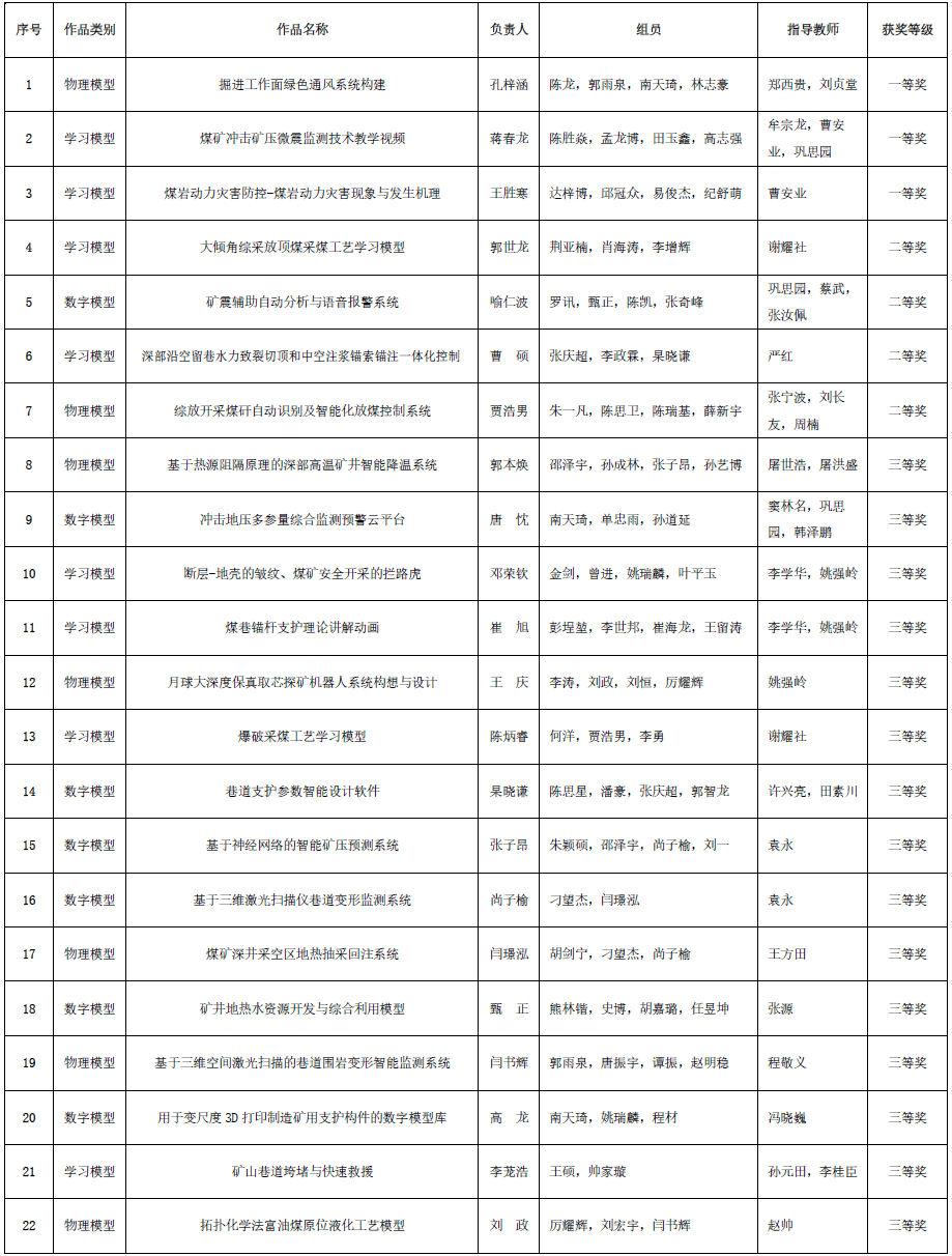 第十一届全国高等学校采矿工程专业学生实践作品大赛获奖名单